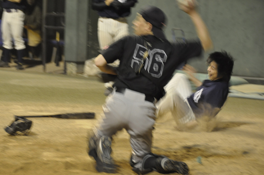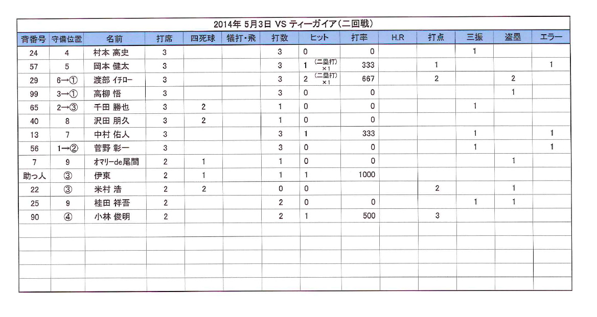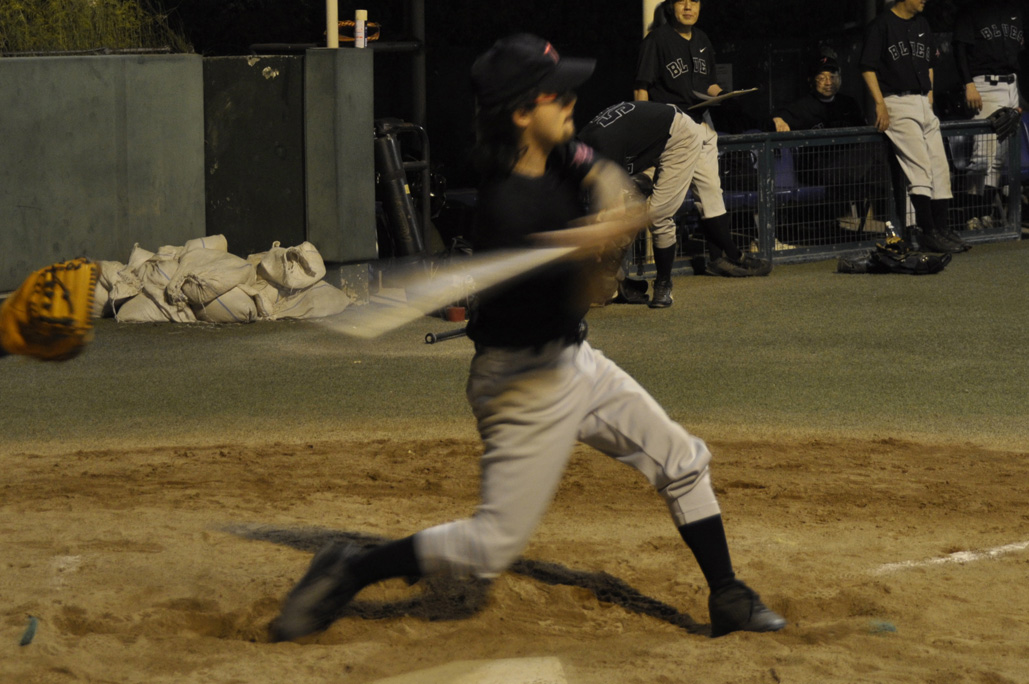 ナイターの夜風が心地よい季節となってきて、照明にグリーンが映える世田谷公園での久々の試合。この日の焦点はもちろん、最近チームとしてのバランスが上がってきたTGIAに、きっちり勝ちきること。そして裏テーマとしては村本さんの復帰後初ヒットと健太のブルース初ヒットのどちらが先にでるか!結果は以下の通り。![]()