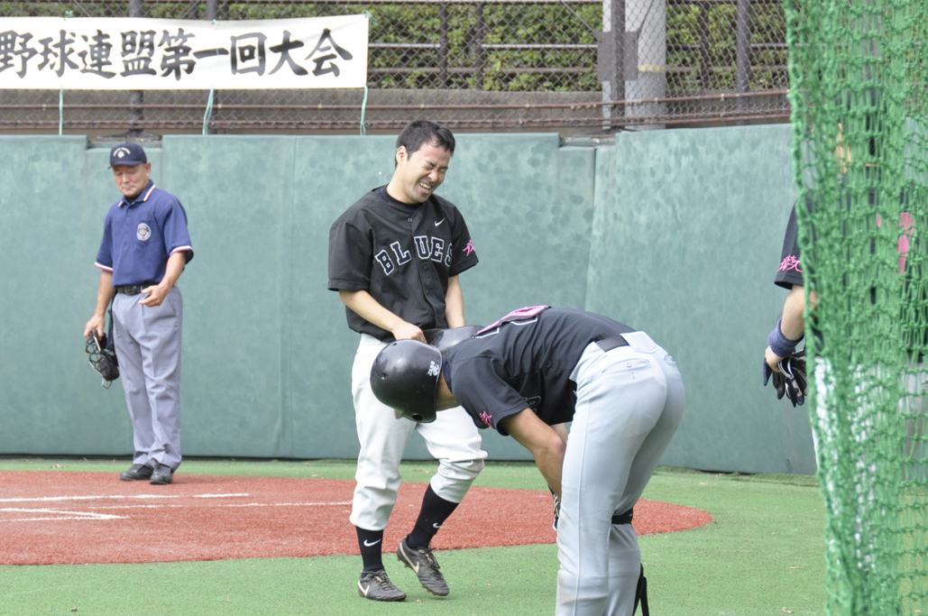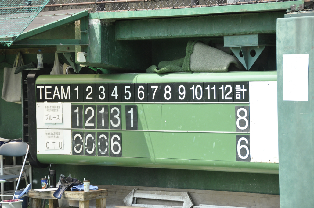 早朝、8時のプレイボール。夜勤明けの彰爺は6時前に会場入りし地元キッズとラジオ体操でストレッチ。そして7時すぎにはメンバーのほとんどが揃ってグラウンドでキャッチボール。各自の気合いが違っていた。序盤、順調に効率的に得点を積み重ね、先週の試合とはうってかわり、楽な試合展開かと思われた4回裏、準決勝まで勝ち上がってきたチームの底力が炸裂。満塁からの走者一掃の2塁打などで一気に一点差に追い上げられた。休養万全だったはずのエースYナベも疲れを見せ始めたとき、最終回をビシッと決めたのが、マッチョ津野。野球を知り尽くした公平の好走塁により点差が2点にひろがったとはいえ、緊迫感のある最終回を見事3人で押さえ、ブルースをついに決勝戦へと導いた!さあ、こうなったら優勝を狙うぞ!!![]()