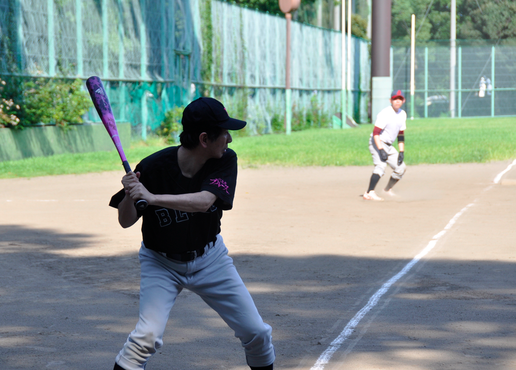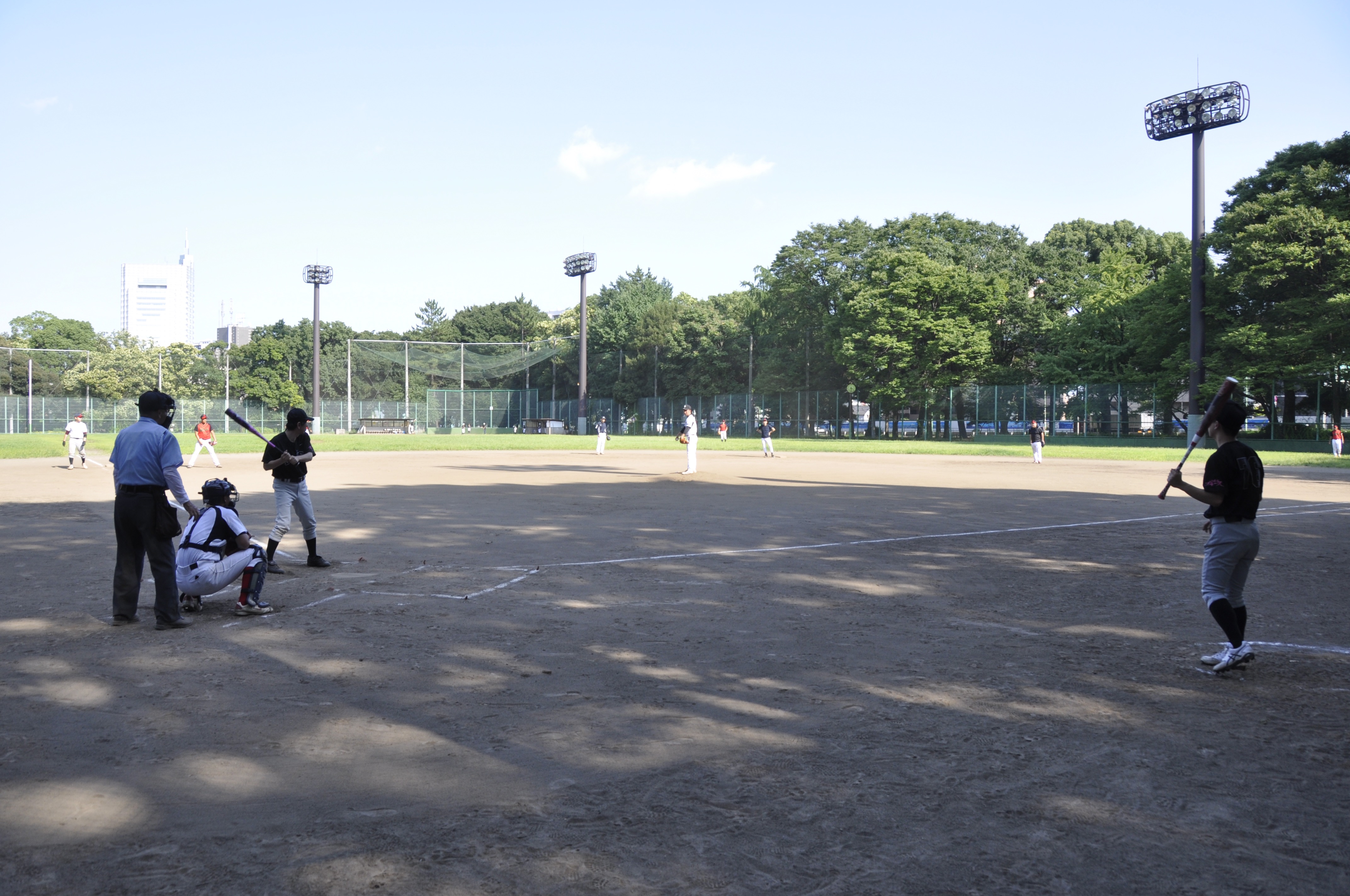 11時〜13時、炎天下の砧公園。ブルースレギュラーメンバーと助っ人合わせ13名が練習に参加。塁間ボール回し、ノック、試合形式のバッティング練習とみっちり2時間汗を流した。