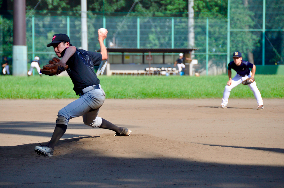 長い梅雨が開けて久々の試合。敵はTANUKIリーグ連覇を続けるMASH。この日は初回、幸先よく2点を先行、その裏ブルースの先発ワッキー塩脇は強打MASh打線をなんとか1点に抑え踏ん張る。しかし厚みのあるMASH打線の迫力に除々に押し戻され、終わってみれば2本のホームランを打たれ6対13の大敗。MASH強し。しかし今後に向けての明るいニュースは、いよいよ期待の新人松﨑が肩の痛みを圧してデビュー。シュアなバッティングを披露。またワッキーを引き継いだ2番手ピッチャー牧田。変化球を織り交ぜ、安定感のあるコントロールを披露。今後の活躍を期待させてくれた。あとは、横綱えんどの20kg減量を待つ!!!