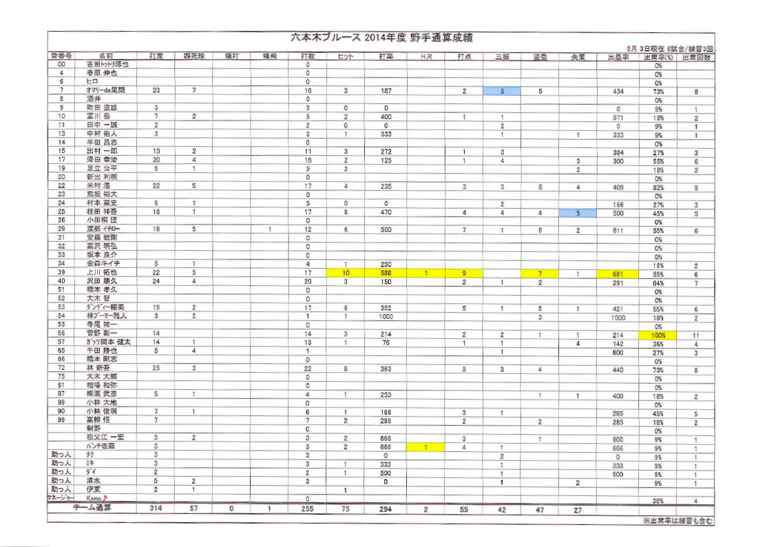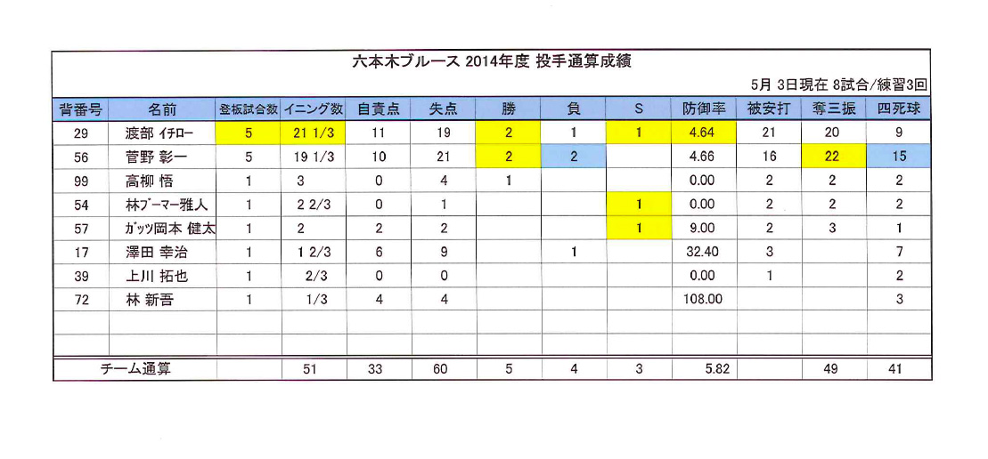 2014年度BLUES選手通算成績(5月3日現在)