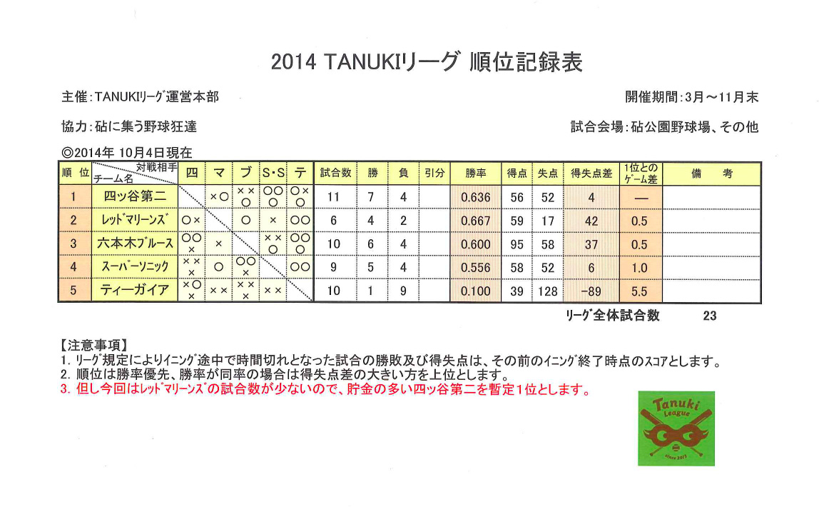 いよいよ混沌、TANUKIリーグ順位表中間発表!!