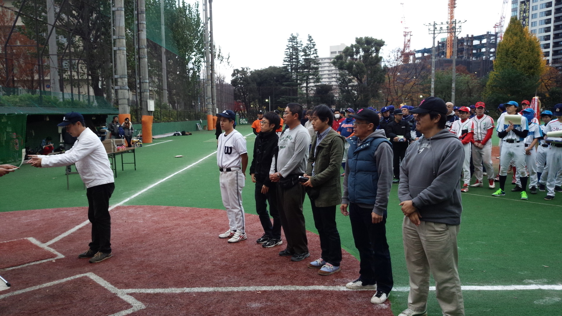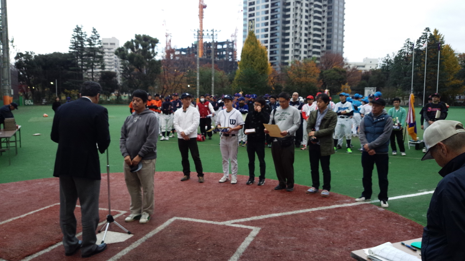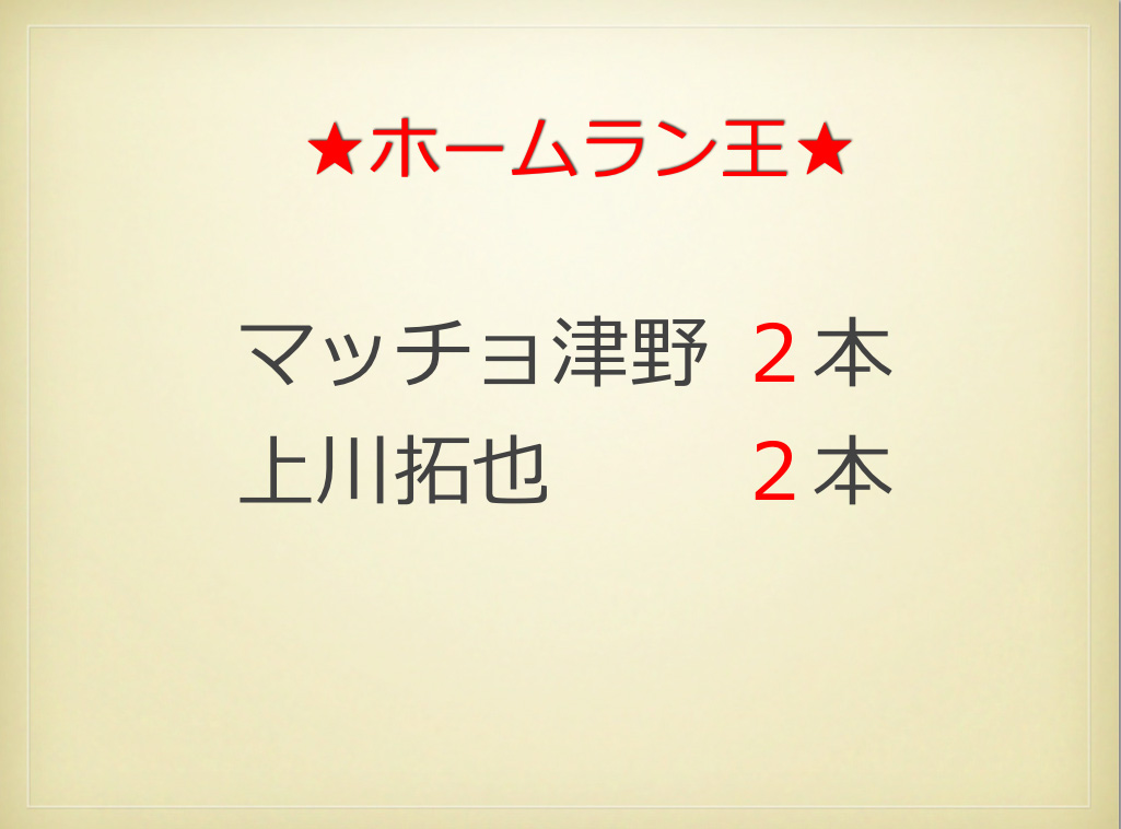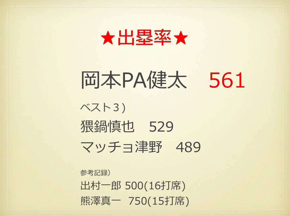 さる11月30日(日)西戸山球場にて決勝戦と表彰式が開催、彰爺とオマリーが出席してくれました(ヨネ監督は遅刻で途中参加)。4部の優勝チームは我々が準決勝で敗れた"三井不動産リース"。しかも、オマリーの報告によると高橋捕手はこの日不参加だったそうです。やはり、現状4部では実力ナンバーワンチームということか。我がブルースも今年の成績により来期は3部昇格が噂されているらしいけれど、何部になっても来年こそはテッペンを目指しましょう。参加者のみんなにメダルを預かってます。納会で渡します!おつかれさまでした!![]()