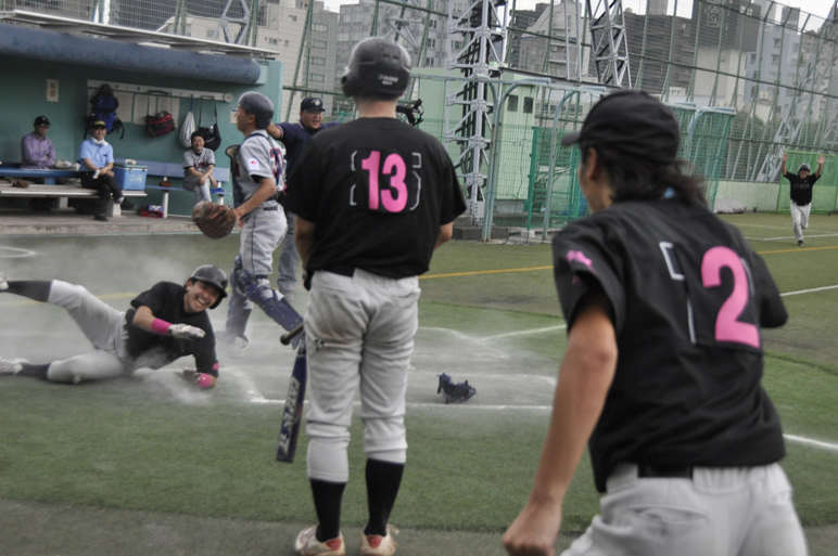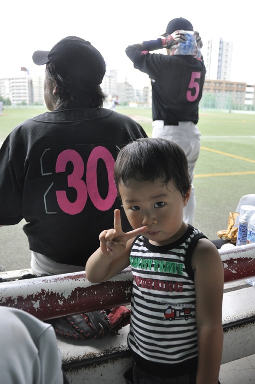 ベンチ内温度計は38度。先発健太の制球が定まらず、先行されては追いつき、また差を付けられて追いつくといった苦しいゲーム展開。3回にはマスクをかぶっていた津野くんがマウンドへ上がり、ピンチをしのぐとサドンデス直前の最終回、ツーアウトランナーなしから、カミちゃんが、内野ゴロも相手の守備の乱れを招いて2塁へ。津野くんのサードゴロをたくみな走塁によりサードの送球を乱し、その間にそのままサヨナラのホームイン!!昨年来の経験が呼んだ貴重な勝利!!Y鍋も牛久(ってどこやねん?)の空から喜んでくれたかな。。![]()