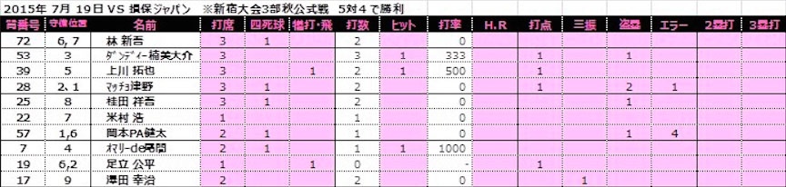 | 損保ジャパン | 2 | 1 | 0 | 1 | 0 | 4 | ||||