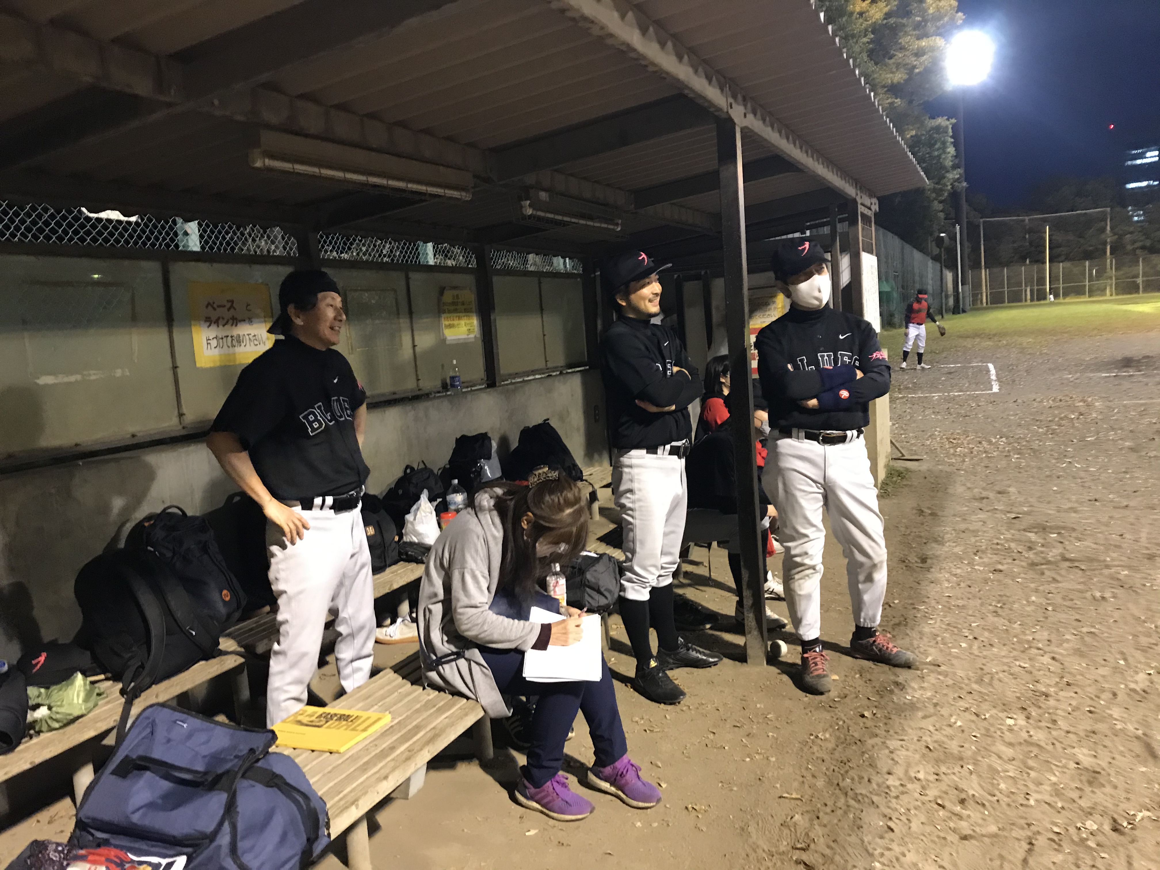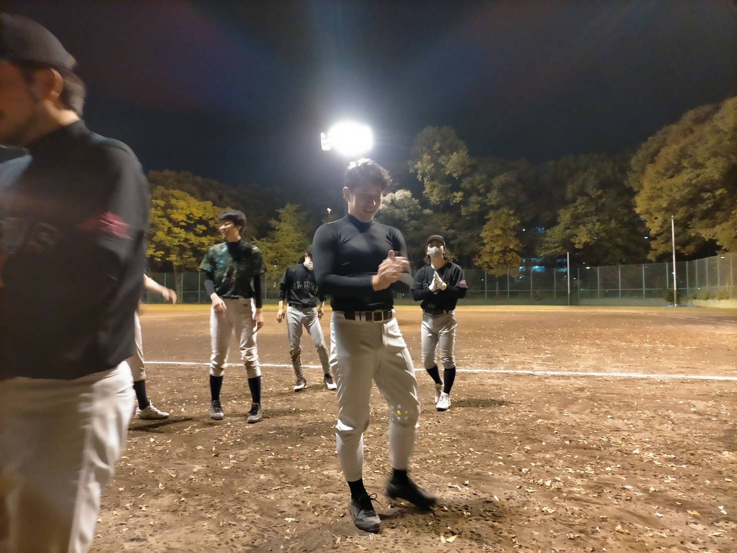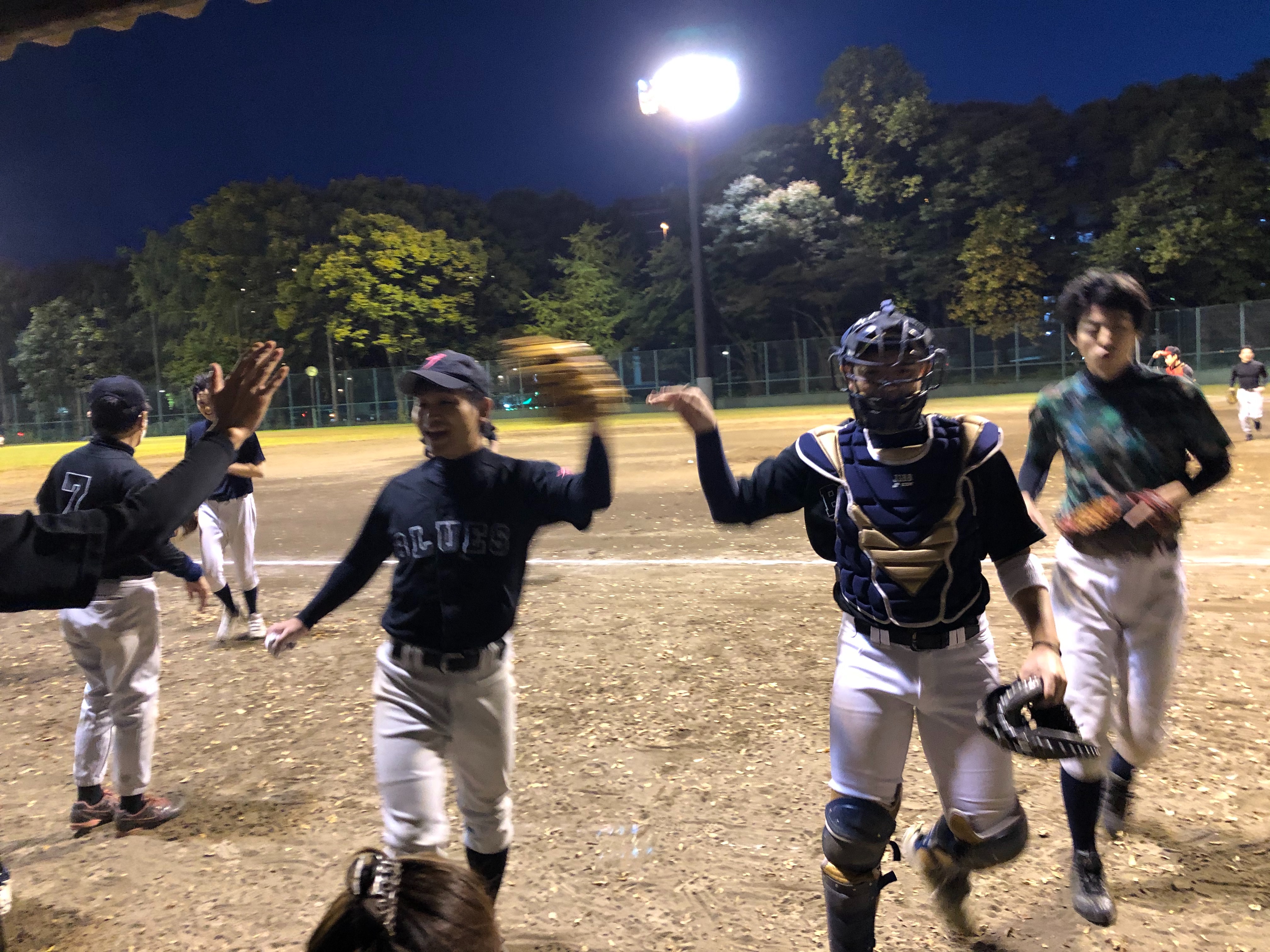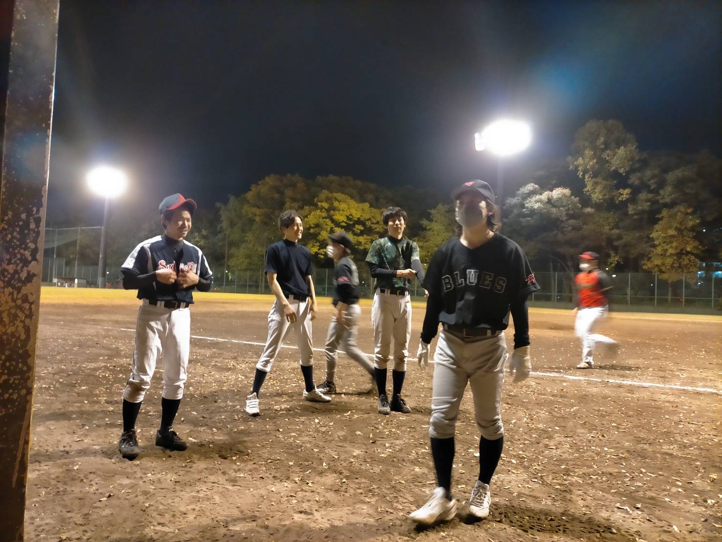清々しい秋の夜空の下、難しいシーズンだった2020年にもぶれない強さを誇りV4を狙う王者Mashに、前節は接戦の末引き分けに終わっていた。今回はそのMASHとの優勝をかけた天王山。ブルースは初回、2回と先制するも、追加点のチャンスは摘み取られ、最小得点での序盤展開。しかし、わがエース健太もランナーを出しながらも、ここ一番での勝負所でMASHのパワーヒッター、そして佐野さん、関野さんといった好打者をねじ伏せ点を与えない。結局終わってみれば6回完封!勝ちたい気持ちがMASHを少しだけ上回っていたのかも。これで5年ぶりのBLUESのTANUKIリーグ制覇をほぼ手中に収めた。両チーム、NICE GAME!!